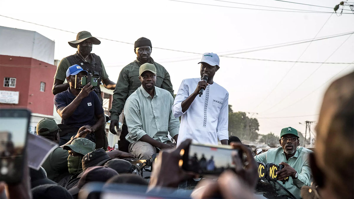 Le candidat à la présidentielle sénégalaise Bassirou Diomaye Faye lors d'un meeting à Cap Skirring, le 16 mars 2024. AFP - MUHAMADOU BITTAYE