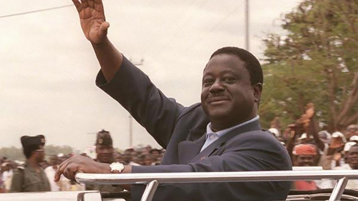 Henri Konan Bédié, président de la République de Côte d'Ivoire, salue ses supporters, le 03 mars 1995 à Bangolo, durant sa campagne pour les élections présidentielles d'octobre 1995. ISSOUF SANOGO / AFP