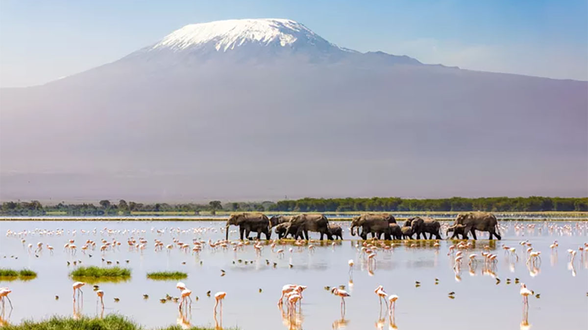 Mont Kilimandjaro avec un troupeau d'éléphants traversant le premier plan. Parc national d'Amboseli, Kenya. Gunter / stock.adobe.com